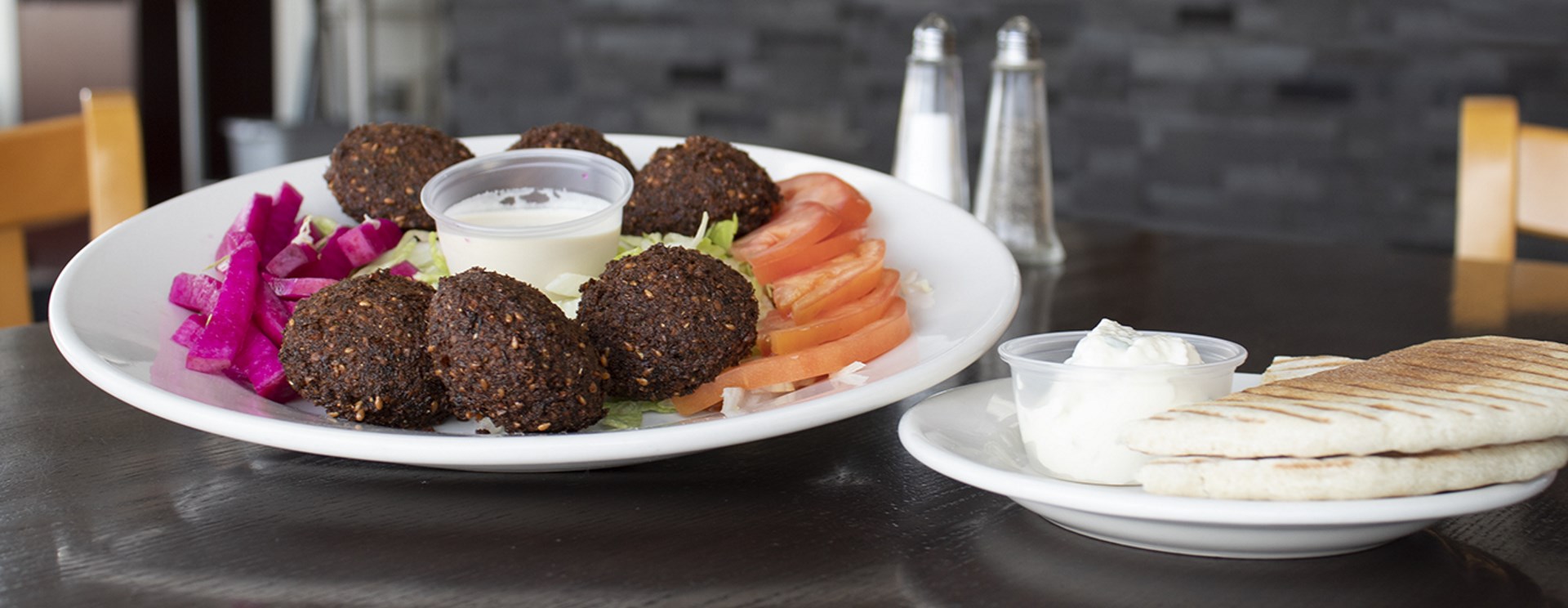 Freshly House-Made Falafel, Tomato Slices, Shredded Lettuce, Pickled Turnips, and Tahini